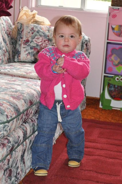 My mom was a ferocious knitter while I was growing up. She used to keep record of all the sweaters she knit, but when she got to 100 she stopped writing them down. She made sweaters for church and play and knit almost every night when we went to bed at 7. Tragically - my mom sold most of the sweaters when I was young - but as a great surprise - when we were emptying the attic she found a box that had a few long lost sweaters! My mom made this sweater for me when I was a little older than Addison and I couldn't wait for the washer and dryer to finish so that she could wear it. Also, except for the light hair - she looks EXACTLY like me when I was her age!